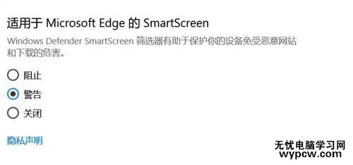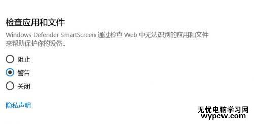 要禁用SmartScreen檢查Windows 應(yīng)用商店中下載的應(yīng)用,請在“Windows Defender SmartScreen 篩選器通過檢查 Windows 應(yīng)用商店應(yīng)用所使用的 Web 內(nèi)容來幫助保護你的設(shè)備。”中選擇關(guān)閉。