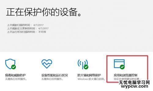2、打開安全中心后,我們會看到如下界面,是的,在Windows 10 之前的版本中Windows Defender的功能也全部移動到這里。我們選擇“應(yīng)用和瀏覽器控制”;