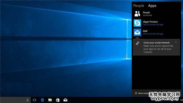 現在外媒曝光了“My People”功能在Win10紅石3系統上的早期版本,因此其頁面和功能看起來還都比較粗糙,安裝體驗很簡單,一個“開始”按鈕,將用戶帶到一個屏幕,用戶可以連接到已安裝的社交網絡功能,比如郵件、人脈和Skype。