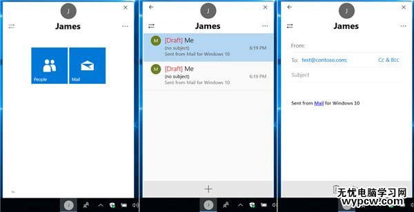 在下面的例子中,“James”鏈接到了人脈的郵件,點擊人脈磁貼將列出聯系人的主要聯系細節,包括他的手機號碼、電子郵件地址等等。點擊郵件應用按鈕將展示我們與James之間的郵件對話,還可以直接在My People UI界面下撰寫回復電子郵件內容。