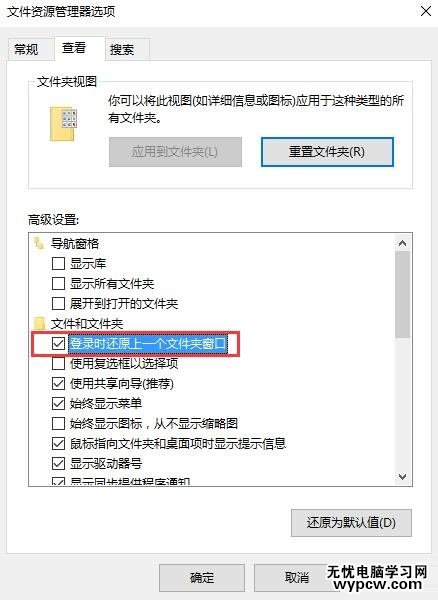 在“查看”選項卡中選中“登錄時還原上一個文件夾”復選框。此后,計算機在重啟后便可以打開之前的窗口。