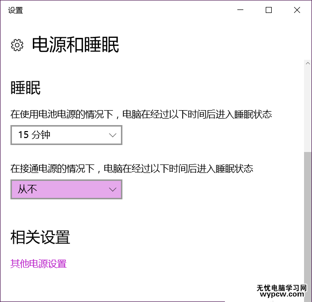 按下開始菜單,輸入“電源”彈出設(shè)置界面,下拉找到“睡眠”,選擇“從不”即可(接通電池的情況下還是默認不改為好)。