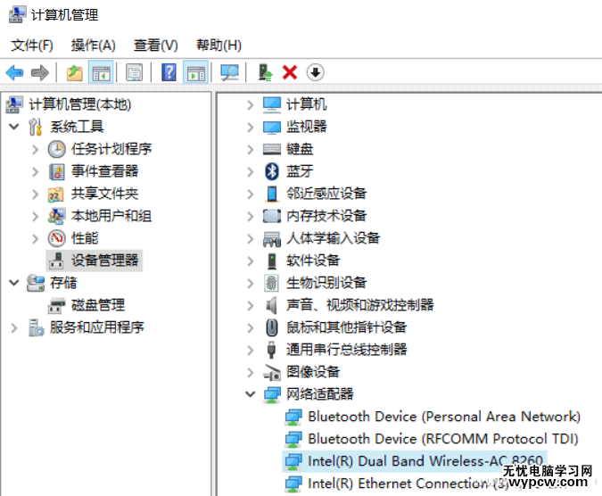 在設(shè)備管理器中找到你的無線網(wǎng)卡,比如小編的就是“Intel(R) Dual Band Wireless-AC 8260”。