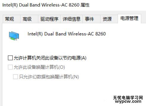 雙擊無線網(wǎng)卡彈出屬性對話框,切換到“電源管理”中,取消勾選“允許計算機及關(guān)閉此設(shè)備以節(jié)約電源”。