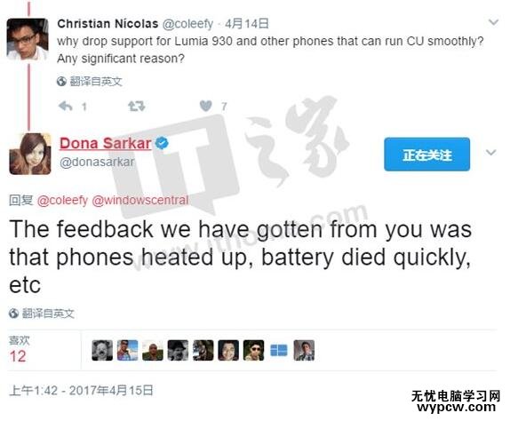 在今天的Twitter問答中,微軟唐娜姐簡單地說明了原因:Lumia930、Lumia1520等舊WP手機設備升級到Win10創意者更新之后會出現設備發熱、電池電量消耗過快等問題。這些關鍵因素讓微軟下定決心不再提供新的Win10更新支持。