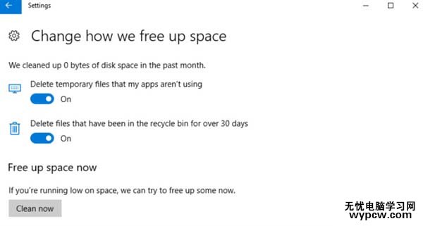 開啟后用戶還需要進(jìn)一步的設(shè)置,總共也就兩個(gè)功能,第一個(gè)選項(xiàng)是允許系統(tǒng)30天自動(dòng)清空回收站,而第二個(gè)選項(xiàng)的具體意義不明,但猜測(cè)應(yīng)該是能夠自動(dòng)清除C:/Temp文件夾下的臨時(shí)文件。