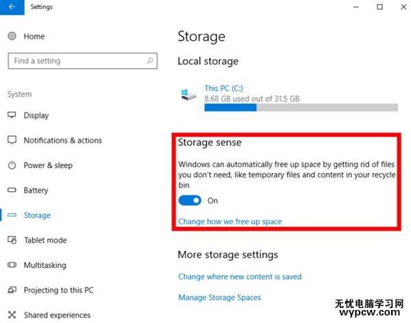 用戶可以在“設(shè)置--系統(tǒng)--存儲(chǔ)”下找到Storage Sense功能的開關(guān)。
