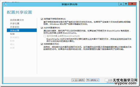 啟用基于存取的枚舉:簡單一點(diǎn)說就是如果A用戶只能訪問A目錄的權(quán)限,那他就不會看到共享下面的B目錄,就不會出現(xiàn)點(diǎn)擊B目錄沒有訪問權(quán)限的提示了,這樣增強(qiáng)了用戶體驗(yàn),同時(shí)也加強(qiáng)文件服務(wù)器的安全性。