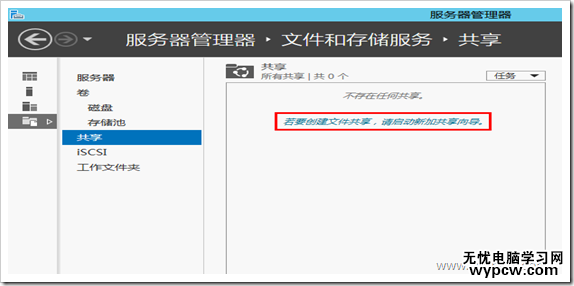 1、點(diǎn)擊“文件和存儲服務(wù)”選擇“共享”,然后點(diǎn)擊“若要創(chuàng)建文件共享,請啟動新加共享向?qū)?rdquo;