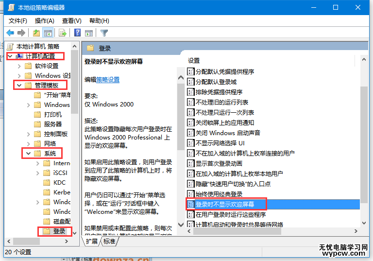 2、在組策略編輯器中依次打開計算機配置--管理模板--系統--登錄,在右側找到“登錄時不顯示歡迎界面”;