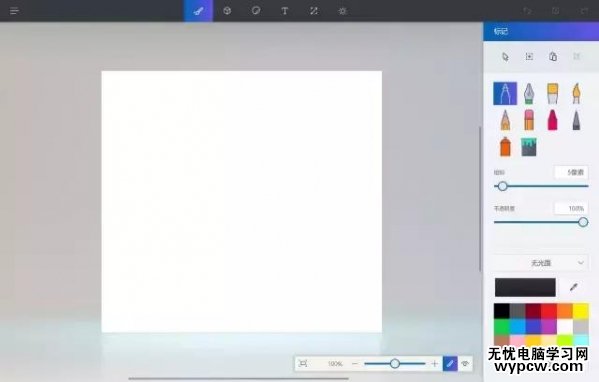 頂部幾個板塊包括繪畫、三維、貼紙、文字等;右邊是具體的工具、顏色、參數等調節。主界面是一塊白板,仔細看的話,它是處在一個三維空間中的,這也是這個軟件的特色,形象來說就是在空間中繪畫。