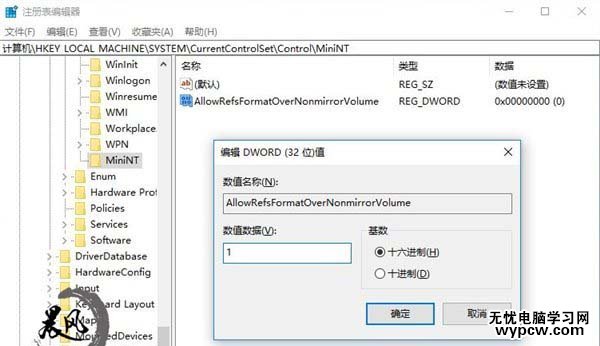 5、新建DWord(32位)值,命名為 AllowRefsFormatOverNonmirrorVolume,如果數值數據為1,表示允許ReFS格式分區在非鏡像卷中啟用
