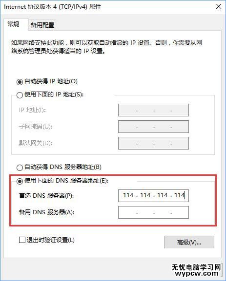 4、單擊【使用下面的DNS服務器地址】,將DNS設置為“114.114.114.114”或“4.2.2.2” 點擊確定-確定,保存即可。