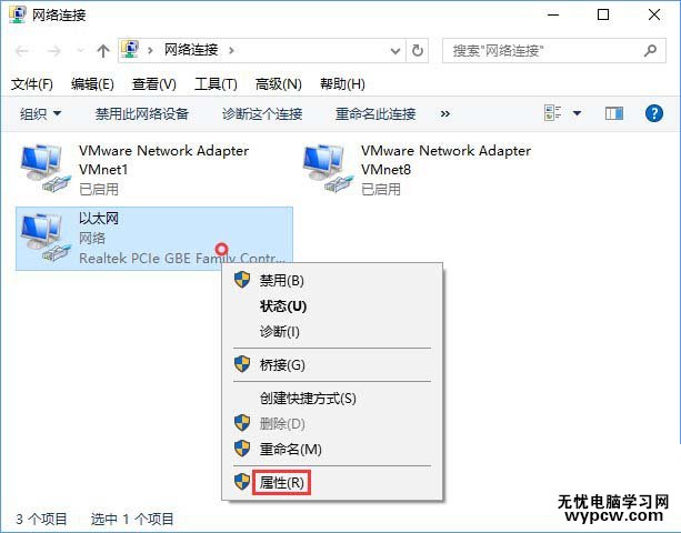 2、此時將進入“網絡連接”界面,右擊“以太網”或“Wlan”圖標,選擇“屬性”;