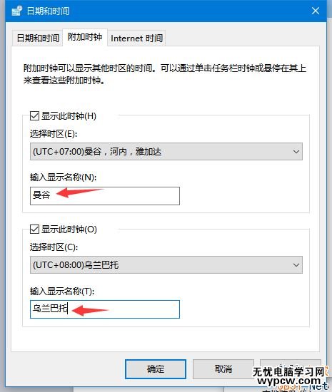 3、在“附加時鐘”標簽下選擇需要額外顯示時間的國家,并輸入顯示的名稱,然后點擊確定;