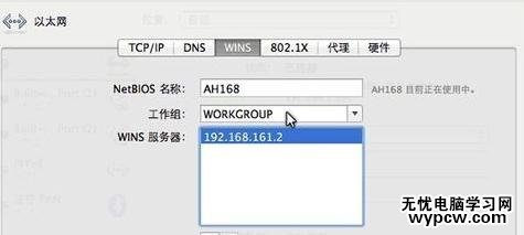 單擊“高級”按鈕進入“高級”設置,將WINS選項卡中的“工作組”設置為你所在局域網的工作組名稱,例如Windows常用的默認設置為大寫的WORKGROUP。這個需要同你所在局域網,如公司內部部門網絡工作組名稱相同。“NetBIOS名稱”可自定義,該名稱就是你在局域網內別人能看到的你的電腦名稱(如圖所示)