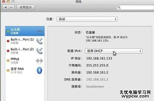 將位置設為自動,接入局域網的網線之后,系統會根據DHCP自動獲取本機在該局域網中的IP地址,分配后即可立即接通網絡使用(如圖所示)。