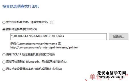 這個時候點擊“我需要的打印機不在列表中”它,在彈出的新窗口中,可以看到5個單按鈕。我們選擇第二項“按名稱選擇共享打印機”,并點擊“瀏覽”。不選擇第三項,是因為第三項成功率不高。