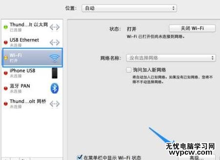 2、點擊窗口左側的“WiFi”,再點擊右邊的“高級”按鈕,如圖所示。