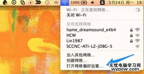 1、打開屏幕頂部的無線網絡圖標,點擊“打開網絡偏好設置”選項,如圖所示