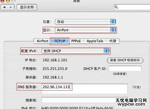 選擇桌面圖標(biāo)“System Preferences”。在彈出的頁面中選擇“網(wǎng)絡(luò)”。彈出網(wǎng)絡(luò)連接設(shè)置頁面,如下圖所示,“位置”選擇“自動”,“顯示”選擇“AirPort”,選擇“TCP/IP”,即可設(shè)置無線網(wǎng)絡(luò)參數(shù)(推薦使用DHCP)。