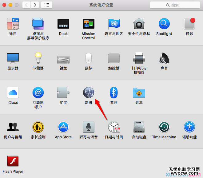 1)在彈出的系統偏好設置對話框選擇“網絡”。