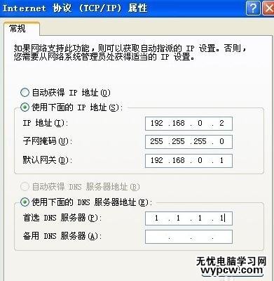 在彈出框中點擊將“自動獲得IP地址”和“自動獲得DNS服務器地址”分別修改為“使用下面的IP地址”以及“使用下面的DNS服務器地址”,并在IP地址欄中輸入“192.168.0.2”,在子網掩碼欄中輸入“255.255.255.0”,在默認網關中入“192.168.0.1”,在首選DNS服務器地址欄輸入“1.1.1.1”,最后點擊確定以保存設置。