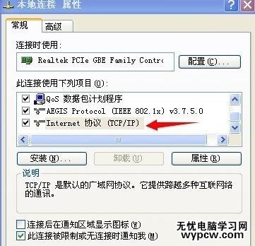 右鍵單擊該圖標,選擇屬性,并在彈出的屬性的常規框中在可下拉菜單中雙擊“Internet協議(TCP/IP)”選項。