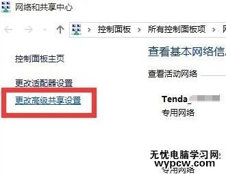 待打開“網絡和共享中心”窗口后,點擊左上角的“更改高級共享設置”按鈕,如圖所示: