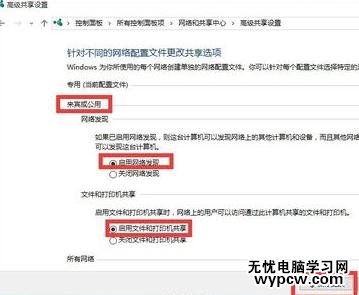 接下來從打開的“更改高級共享設置”界面中,展開“來賓或公用”欄目,勾選“啟用網絡發現”和“啟用文件和打印共享”項,點擊“保存設置”按鈕。