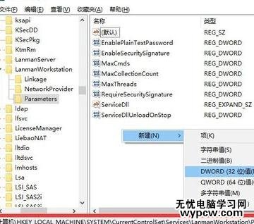 依次展開“[HKEY_LOCAL_MACHINE/SYSTEM/CurrentControlSet/Services/LanmanWorkstation/Parameters] ”項,在右側空白處右擊鼠標,從其右鍵菜單中選擇“新建”-“DWORD值(32位)”項。