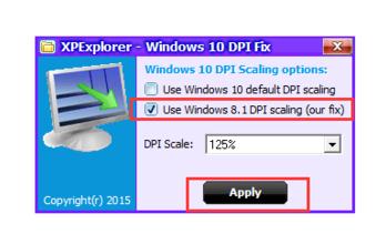 在高分屏下,我們僅僅需要選擇Win8.1系統(tǒng)的DPI縮放應(yīng)用設(shè)置界面,然后選擇縮放比例為125%,點(diǎn)擊“Apply ”按鈕即可。