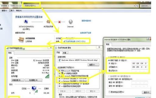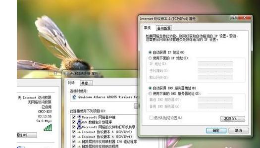 我們進入網絡共享中心主界面,我們找到無線網絡連接這一項,點擊并打開無線網絡連接狀態欄,我們點擊屬性,找到Internet協議版本4(Ip4)這一項,把使用下面的地址,改為自動獲取地址。注意兩個都改為自動獲取地址。