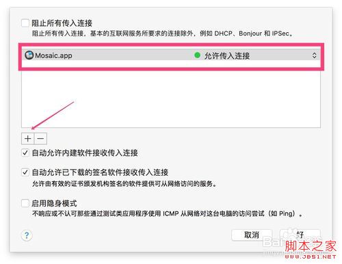 點擊箭頭那里的加號,選擇需要禁止聯網的軟件,然后點擊方框內的允許聯網的選項。變成紅色即可。最好點擊好,這樣子就禁止了app的聯網。