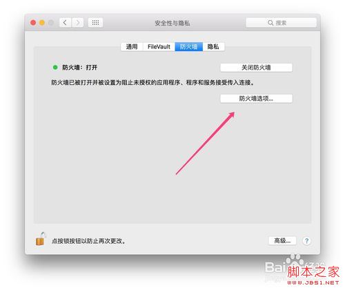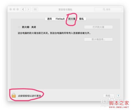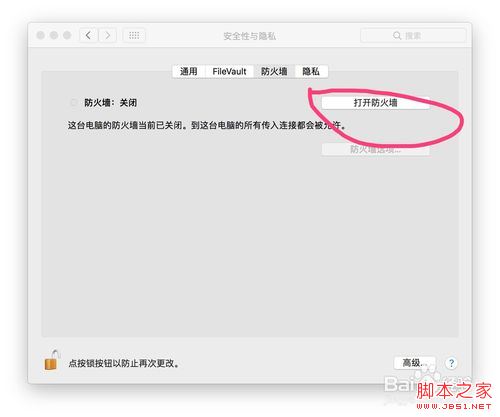 選擇防火墻,然后點擊左下角的黃色小鎖頭解鎖,輸入開機密碼解鎖。就是管理員密碼。