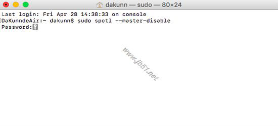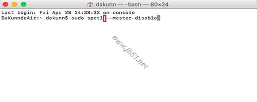 2、然后,輸入代碼:sudo spctl --master-disable(master前面為兩個短橫線)注意紅框處是空格。