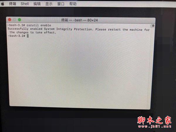 2、進(jìn)入終端以后,在終端我們需要輸入“csrutil disable”這條命令,按下回車,看到下面的提示成功以后我們就解除系統(tǒng)的權(quán)限控制了。