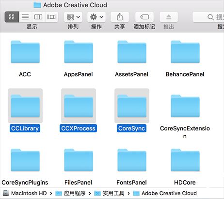 三:前往/Applications/Utilities/Adobe Creative Cloud,刪除CCLibrary、CCXProcess以及CoreSync文件夾。