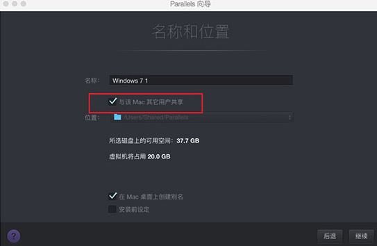 在“名稱和位置”這一步驟中勾選“與該Mac其它用戶共享”,這樣新的虛擬機將自動放置在/Users/Shared/Parallels目錄中,并會向此計算機的所有用戶授予一切必要權限。