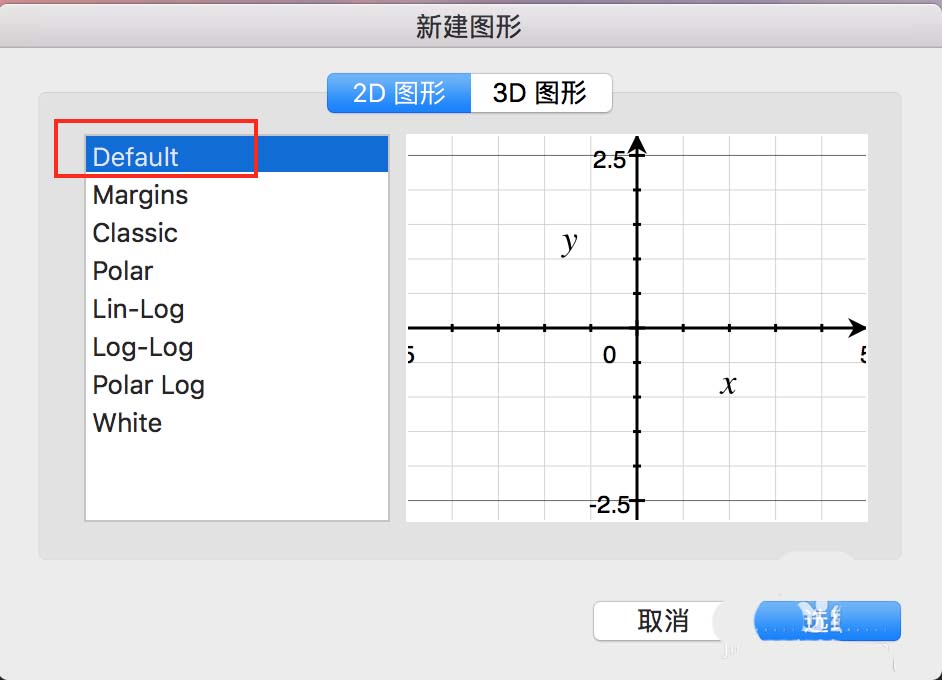 3、新建圖形,選擇“2D圖形”,選擇“default”,咱們先畫一個簡單的函數圖像。其實,正如看到的,它很牛,還可以畫復雜2D,甚至3D的圖像的。