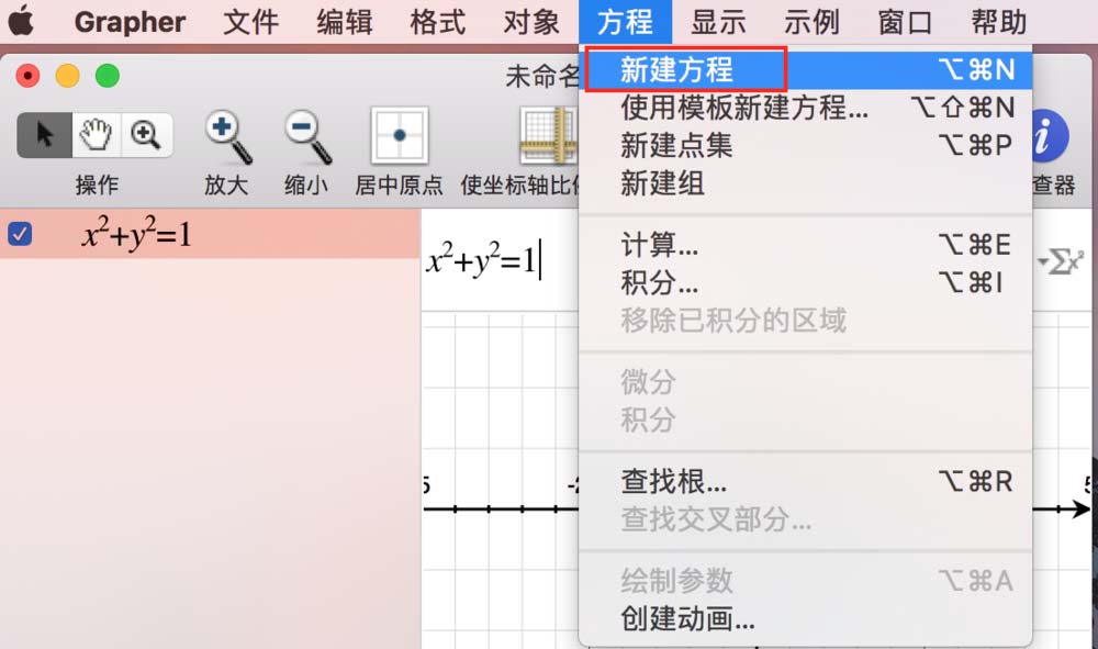5、更復雜的,還可以在同一坐標系中畫很多函數圖像。“方程”->“新建方程”就可以再寫一個方程,畫一個圖像。