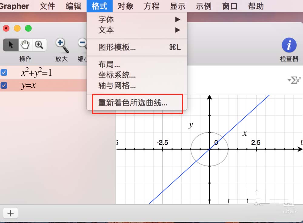 7、函數圖像多了,不好區分,可以通過改變函數線的顏色來區別。點擊“格式”->“重新著色所選曲線”就可以改變曲線的顏色啦。