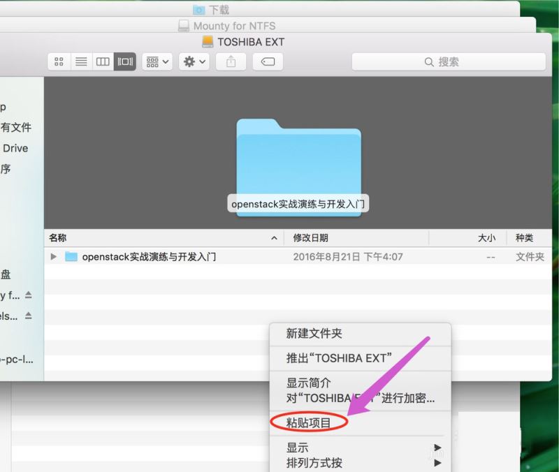3、在 Mac 上打開采用 NTFS 的移動硬盤時,點擊鼠標右鍵沒有“粘貼”寫入的選項,直接把 Mac 上的文件拖進去也是不行的。