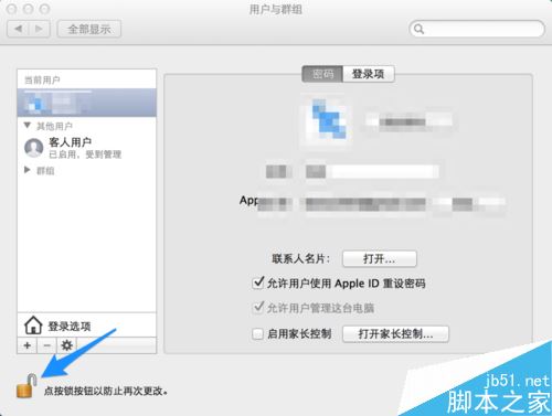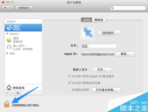 隨后可以看到窗口左側顯示當前的所有用戶,便顯示為灰色不可刪除。這時請點擊窗口左下角的“鎖”按鈕圖標,如圖所示