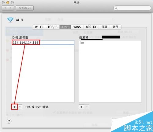 點擊“-”減號旁邊的“+”號,并輸入114DNS的IP地址:114.114.114.114,然后點擊“好”按鈕;