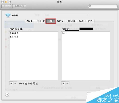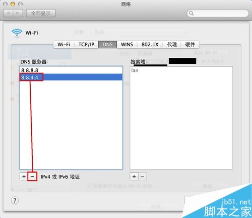 可以看到默認的DNS,點擊一條DNS地址并點擊下面的“-”減號按鈕刪除這個DNS地址,按照這個步驟將所有的DNS刪除;