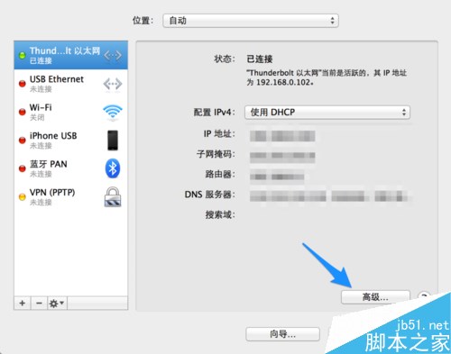 隨后在網(wǎng)絡(luò)窗口中,在左側(cè)先選擇當(dāng)前用于上網(wǎng)的活動(dòng)連接,再點(diǎn)擊右窗格中的“高級(jí)”按鈕,如圖所示