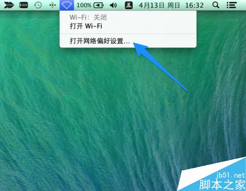 在屏幕頂部的系統(tǒng)狀態(tài)欄中,點(diǎn)擊網(wǎng)絡(luò)圖標(biāo)并選擇“打開(kāi)網(wǎng)絡(luò)偏好設(shè)置”選項(xiàng),如圖所示