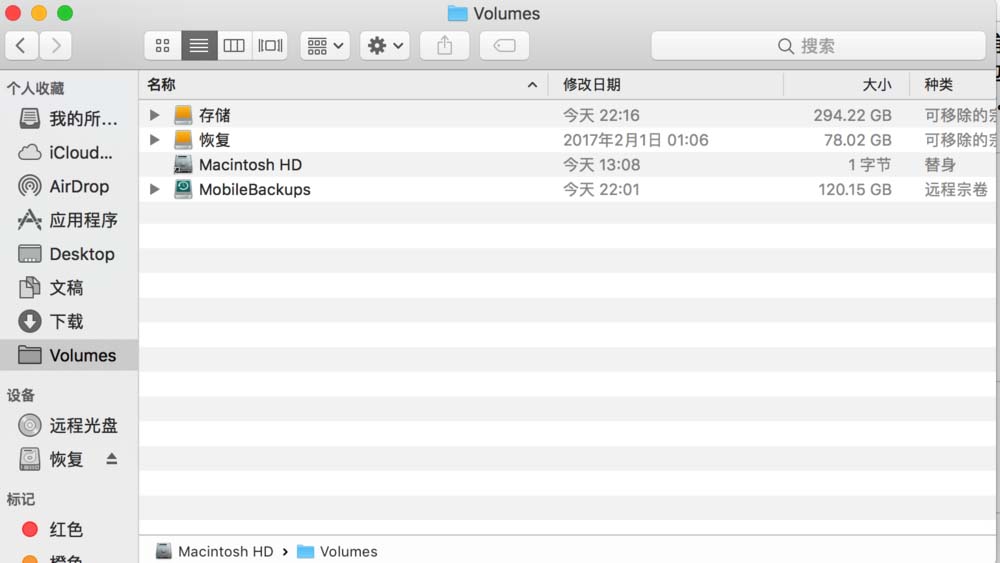 由于新掛載的ntfs盤不能顯示在Finder中,所以打開Finder前往文件夾 /Volumes,然后在用 cmmand+control+T 將 /Volumes 保存到邊欄,在插入移動設備后不會在桌面顯示,可以在Finder邊欄的Volumes中查看。