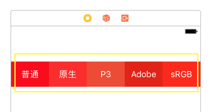 7、下面是一個簡單的測試顏色的手機應用,只顯示一排有顏色的Label,每個Label的顏色就是上一步驟中取到的不同模式下的純紅色。通過肉眼觀察,不同顯示模式取到的紅色,在使用到手機應用上的時候,顏色是有差別的。